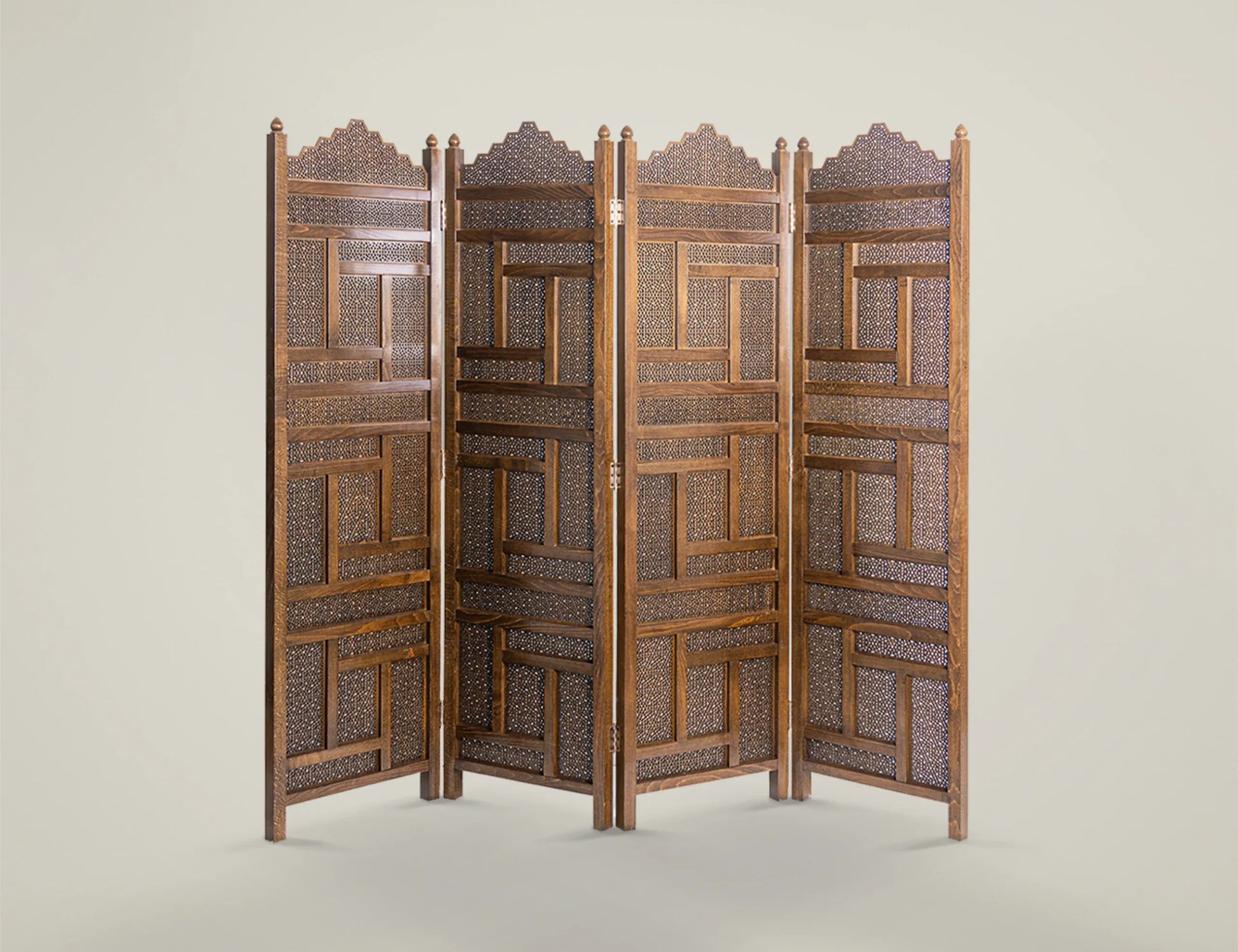Meticulously carved from premium pitch pine, the Arvad paravan features intricate geometric latticework and pointed arch motifs reminiscent of Islamic and Arabian design influences. Its five folding panels allow for flexible placement, offering both privacy and decorative presence in any space.