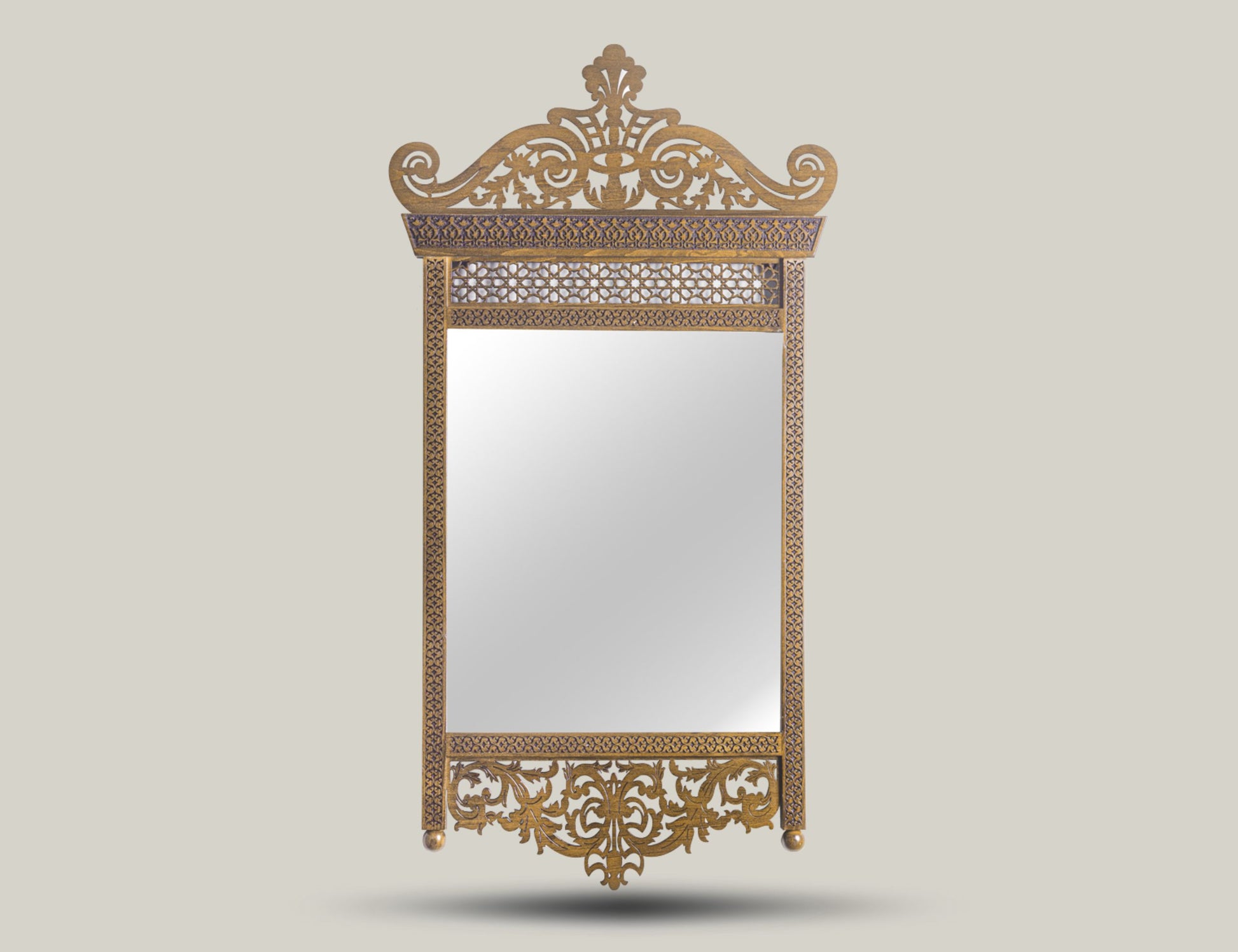 A tribute to the opulent artistry of Damascus, the Nahlaya Crown Mirror showcases intricate floral latticework and ornamental crown detailing, inspired by regal Levantine design. Hand-carved from solid pitch pine wood, this wall mirror features a sweeping top crest and delicately pierced lower frieze that echo classical Italian influence, fused with Damascene charm.