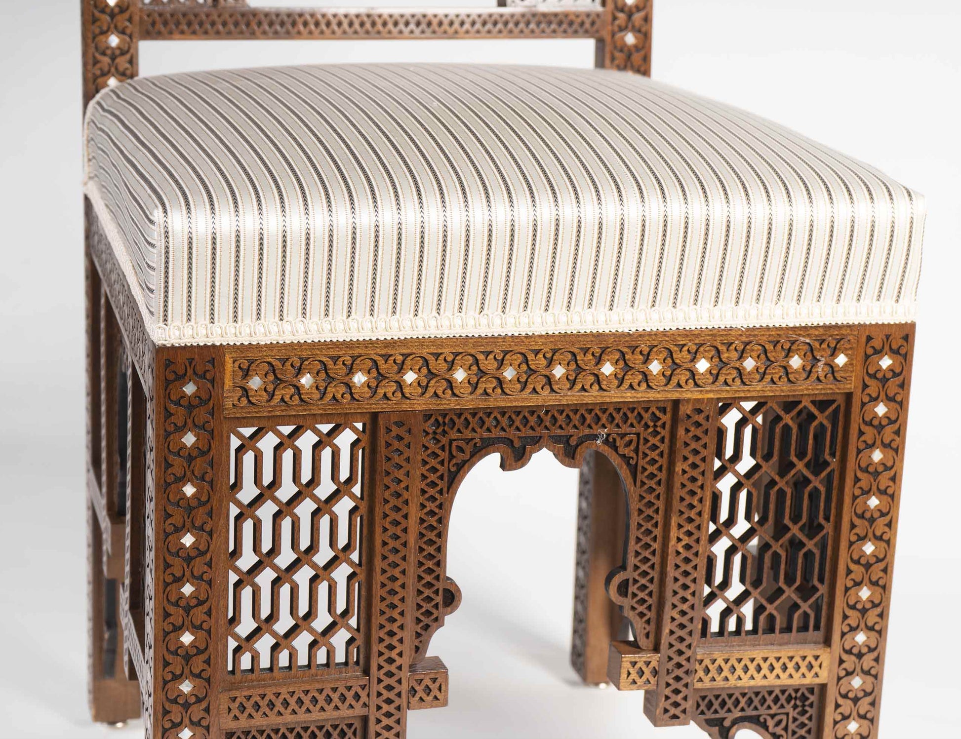 Crafted from solid pitch pine, chairs is adorned with 286 individual mother of pearl inlays, featuring iconic arch motifs, intricate latticework, and ornamental symmetry. The table complements this design language with an astonishing 792 hand-set mother of pearl inlays, a geometric central medallion, and detailed arabesque carving along its frame.