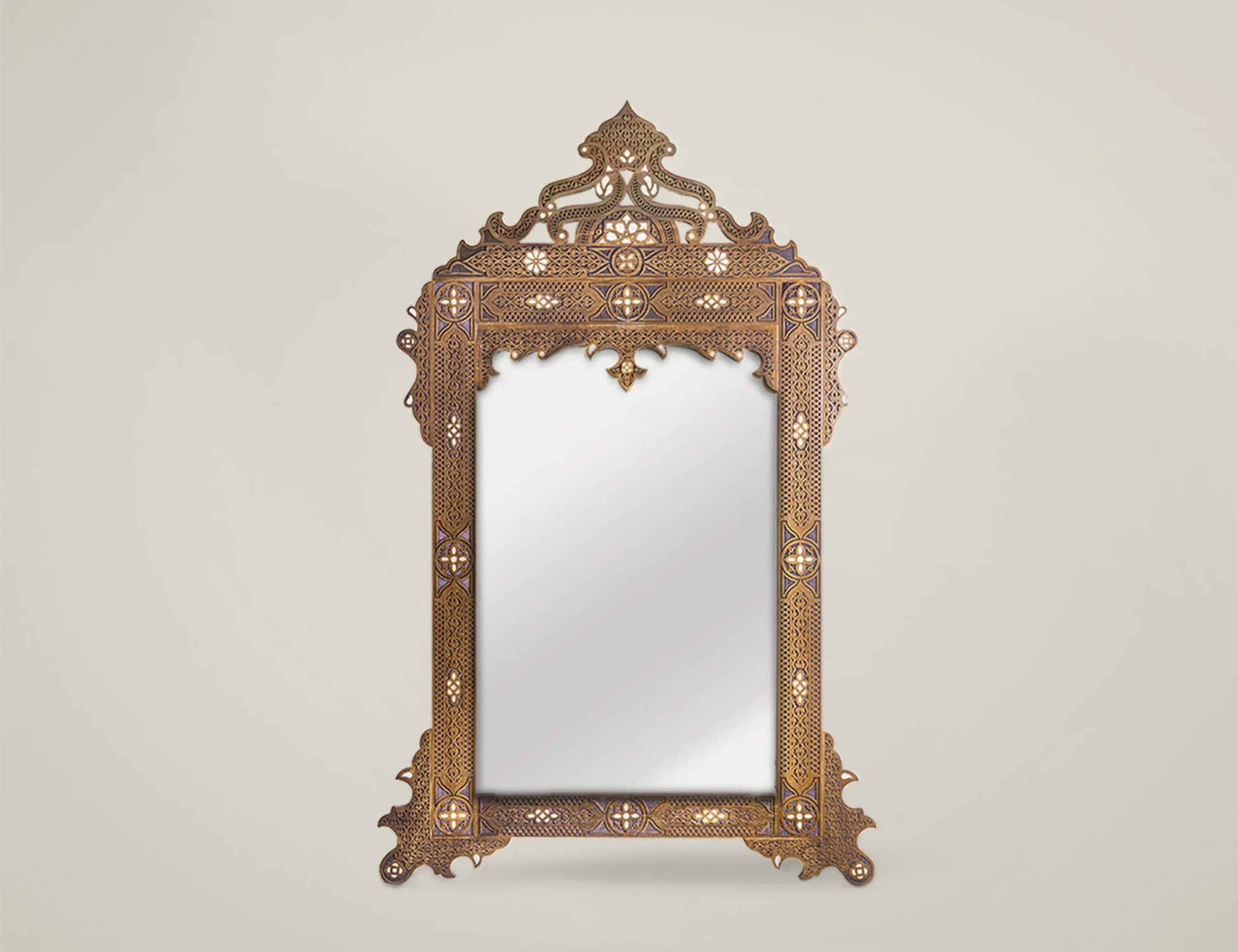 Malka — meaning “queen” in ancient Semitic languages — lives up to its name with an air of grandeur and heritage. This commanding wall mirror is a masterful expression of timeless elegance, blending Middle Eastern royal motifs with the sophistication of traditional craftsmanship.