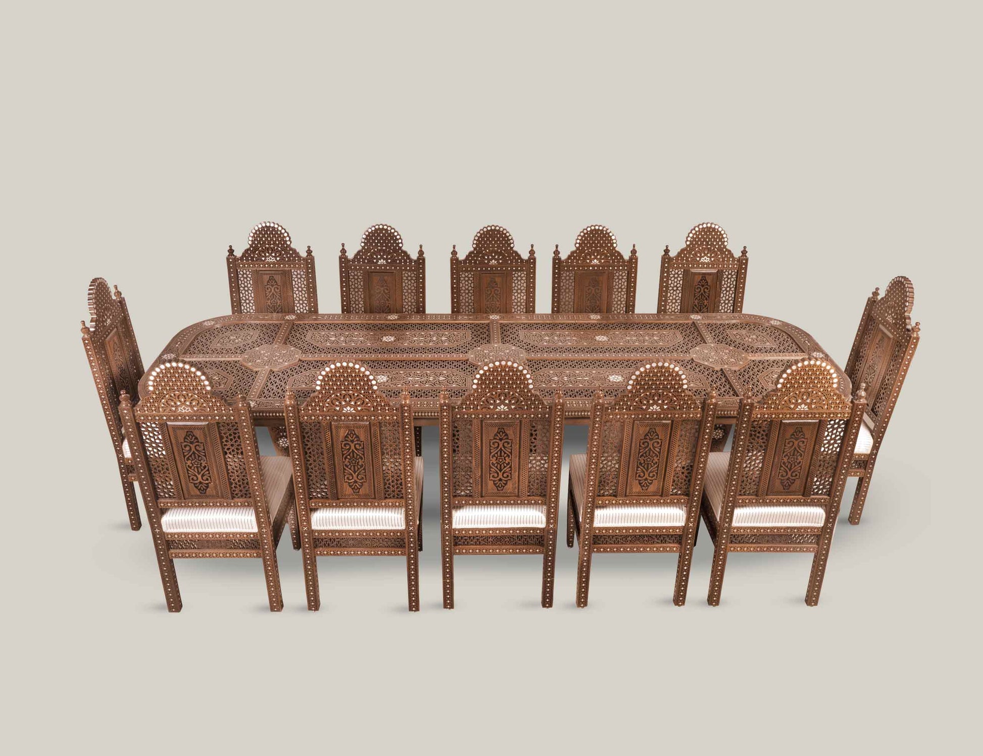 Accompanying the table are 12 Damascene-style chairs, each echoing the same craftsmanship and carved detailing, creating a harmonious dining atmosphere rooted in Syrian heritage and Moorish design traditions.