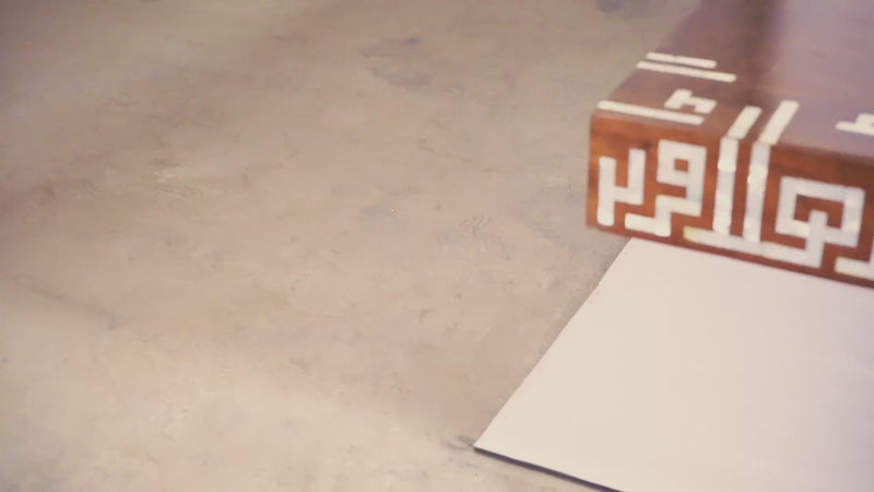 Measuring 122 x 122 x 10 cm, this square table commands attention with its strong, low-profile base and refined symmetry. The top features a mesmerizing geometric inlay crafted from mother of pearl, creating a rhythmic pattern that draws the eye inward. Along the edges, intricate Kufic calligraphy spells out the Arabic phrase "Ahlan wa Sahlan" (Welcome), inlaid with luminous precision to reflect the spirit of openness and reception.