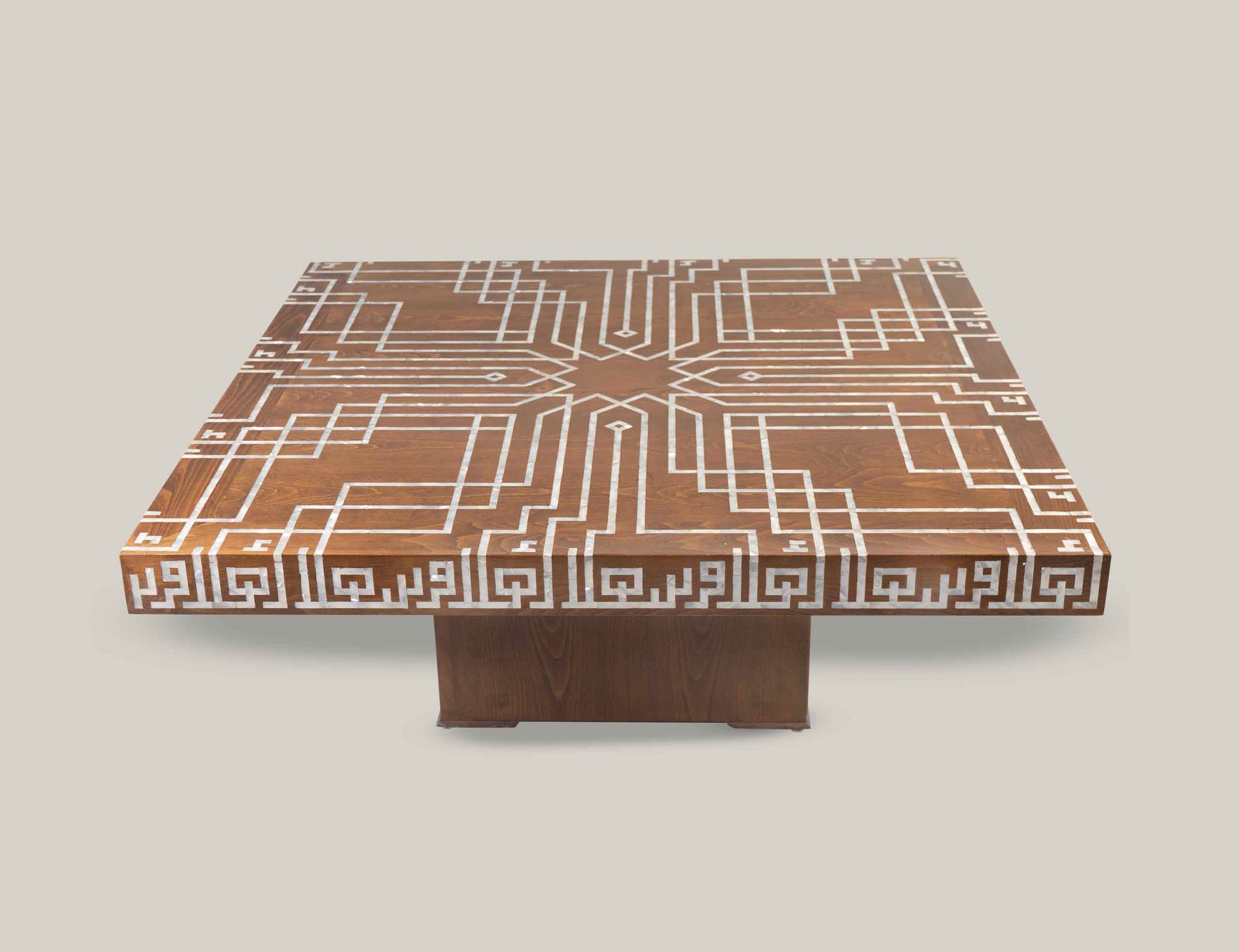 Measuring 122 x 122 x 10 cm, this square table commands attention with its strong, low-profile base and refined symmetry. The top features a mesmerizing geometric inlay crafted from mother of pearl, creating a rhythmic pattern that draws the eye inward. Along the edges, intricate Kufic calligraphy spells out the Arabic phrase "Ahlan wa Sahlan" (Welcome), inlaid with luminous precision to reflect the spirit of openness and reception.